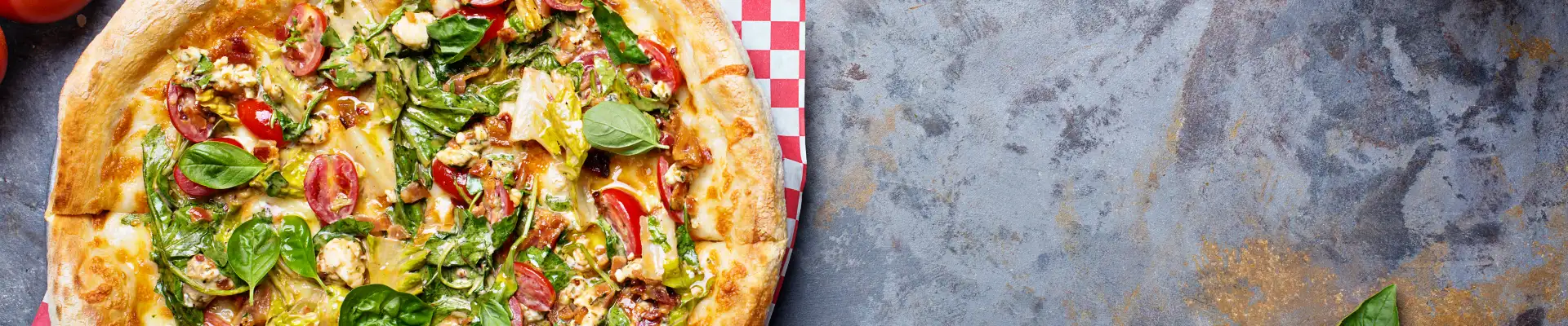 fina camada de mussarela, peito de peru, folha de alface, rúcula, tomate cereja levemente puxado na mostarda, parmesão, azeitonas e orégano